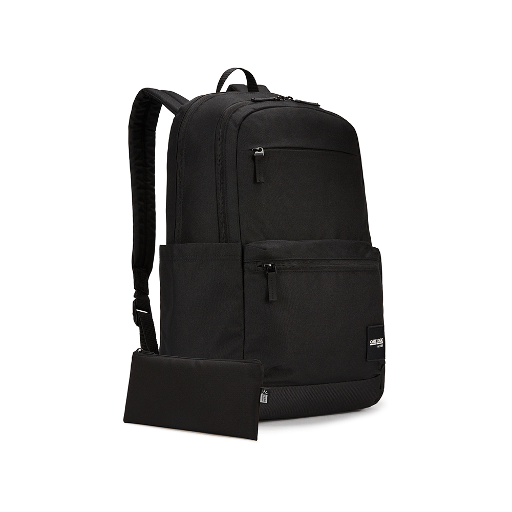 Uma mochila eficiente com capacidade de armazenamento de 26 litros, incluindo dois compartimentos grandes, bolsos frontais duplos e ampla organização, fabricada com materiais reciclados.